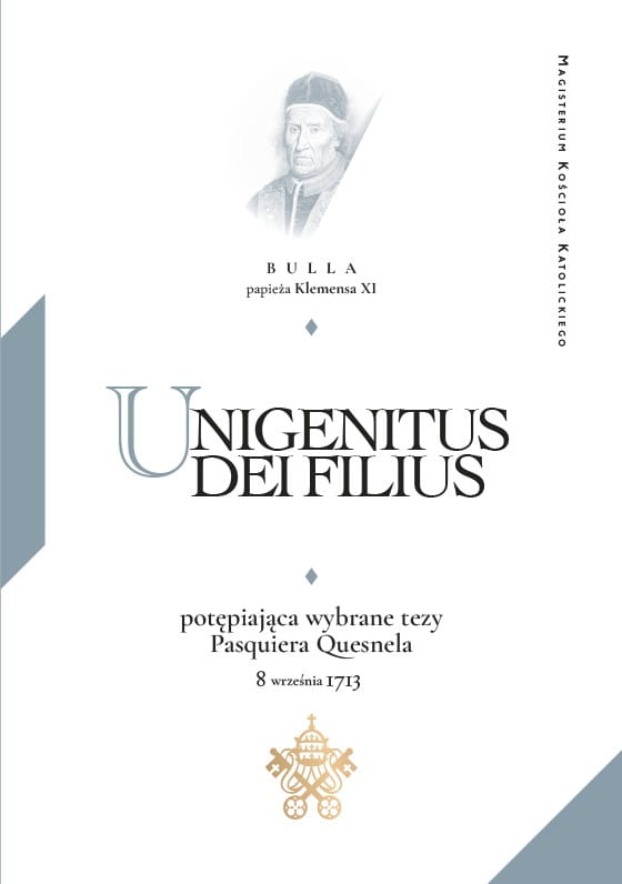 Pierwszy polski przekład Bulli Klemensa XI, potępiającej 101 twierdzeń francuskiego teologa, zwolennika jansenizmu, Pasquiera Quesnela. W 1671 r. Quesnel opublikował książkę zawierającą cztery Ewangelie po francusku, z krótkimi notatkami objaśniającymi tekst. Książka miała także służyć jako pomoc do medytacji. Dzieło zostało zatwierdzone przez biskupa Félixa Vialarta z Châlons, chociaż już pierwsze wydanie dzieła zawierało kilka błędów jansenistycznych. Kolejne wydania były już przesiąknięte praktycznie wszystkimi błędami jansenizmu, wobec czego kilku biskupów zakazało czytania dzieł Quesnela w swoich diecezjach, a Klemens XI potępił je w swoim breve, Universi Dominici gregis, datowanym 13 lipca 1708 r. Okazało się jednak, że breve to za mało. W lutym 1712 r. Klemens XI powołał specjalną kongregację kardynałów i teologów, aby wyselekcjonować z prac Quesnela takie propozycje, które zasługiwały na kościelną naganę. Bulla potępiająca tezy Quesnela została podpisana przez papieża 8 września 1713 r.