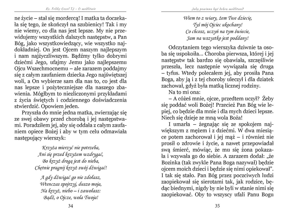 Ks. Cozel w sposób prosty, a zarazem dobitny, przedstawia swoje rozważania, wzbogacając je licznymi odwołaniami do Pisma Świętego oraz wypowiedziami teologów czy świętych. Z jego słów jasno wynika, że Bogu podoba się człowiek, który modli się szczerze i wytrwale. Uważamy, że jest to jedna z ważniejszych książeczek autorstwa księdza Cozela, jakie wydaliśmy. Choć objętościowo niewielka, treścią wypełniona jest po brzegi. To pierwsze wydanie od ponad stu lat. Nie przedłużając – zapraszamy Państwa do lektury tej cennej pozycji.