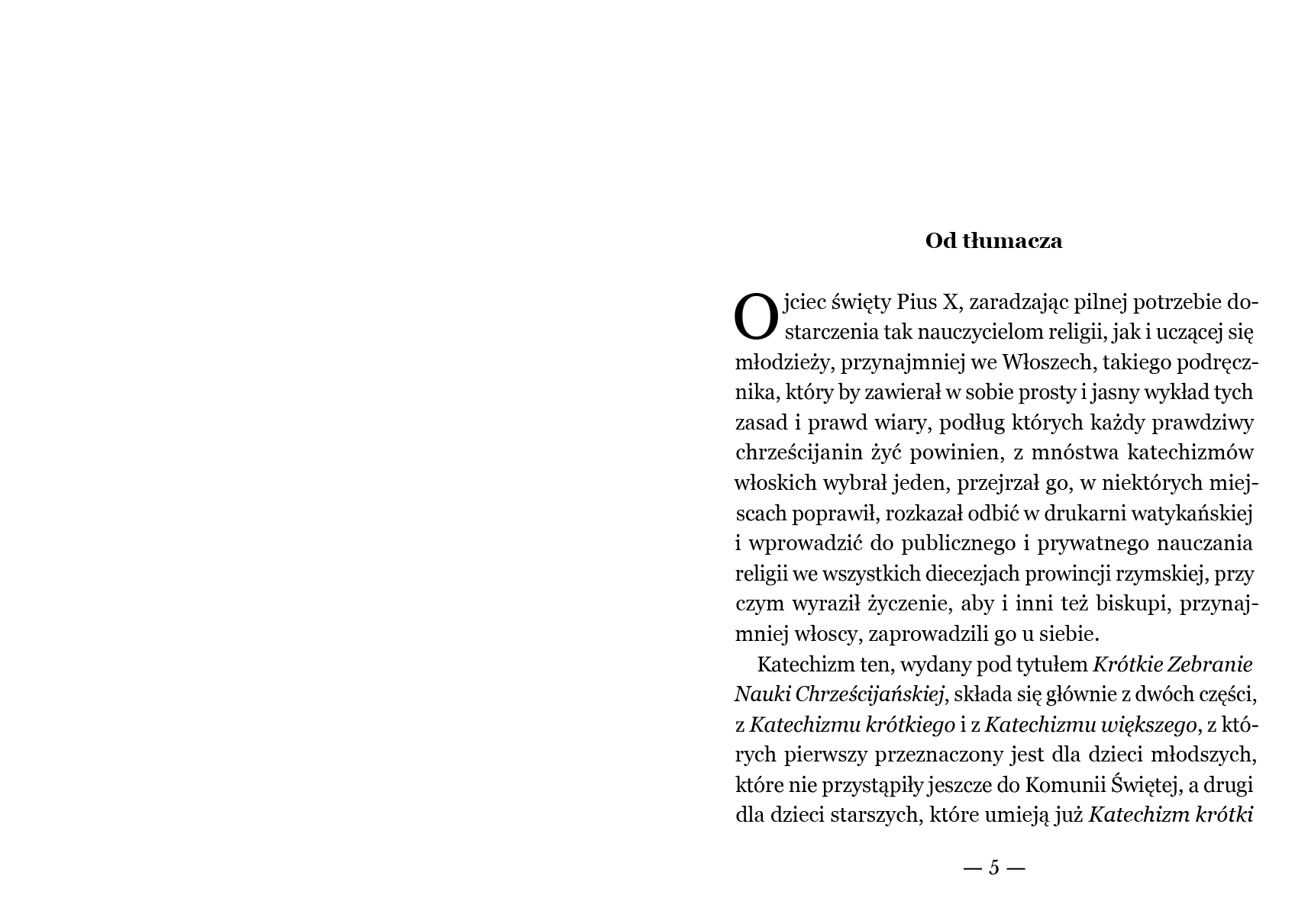 Ojciec święty Pius X, zaradzając pilnej potrzebie dostarczenia tak nauczycielom Religii, jak i uczącej się młodzieży, przynajmniej we Włoszech, takiego podręcznika, któryby zawierał w sobie prosty i jasny wykład tych zasad i prawd wiary, podług których każdy prawdziwy chrześcijanin żyć powinien, z mnóstwa katechizmów włoskich wybrał jeden, przejrzał go, w niektórych miejscach poprawił, rozkazał odbić w drukarni Watykańskiej i wprowadzić do publicznego i prywatnego nauczania Religii we wszystkich diecezjach prowincji rzymskiej, przyczem wyraził życzenie, aby i inni też Biskupi, przynajmniej włoscy, zaprowadzili go u siebie.