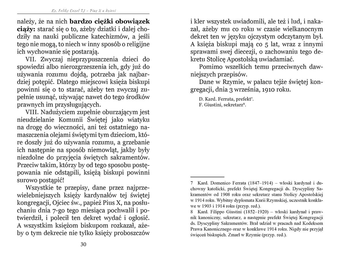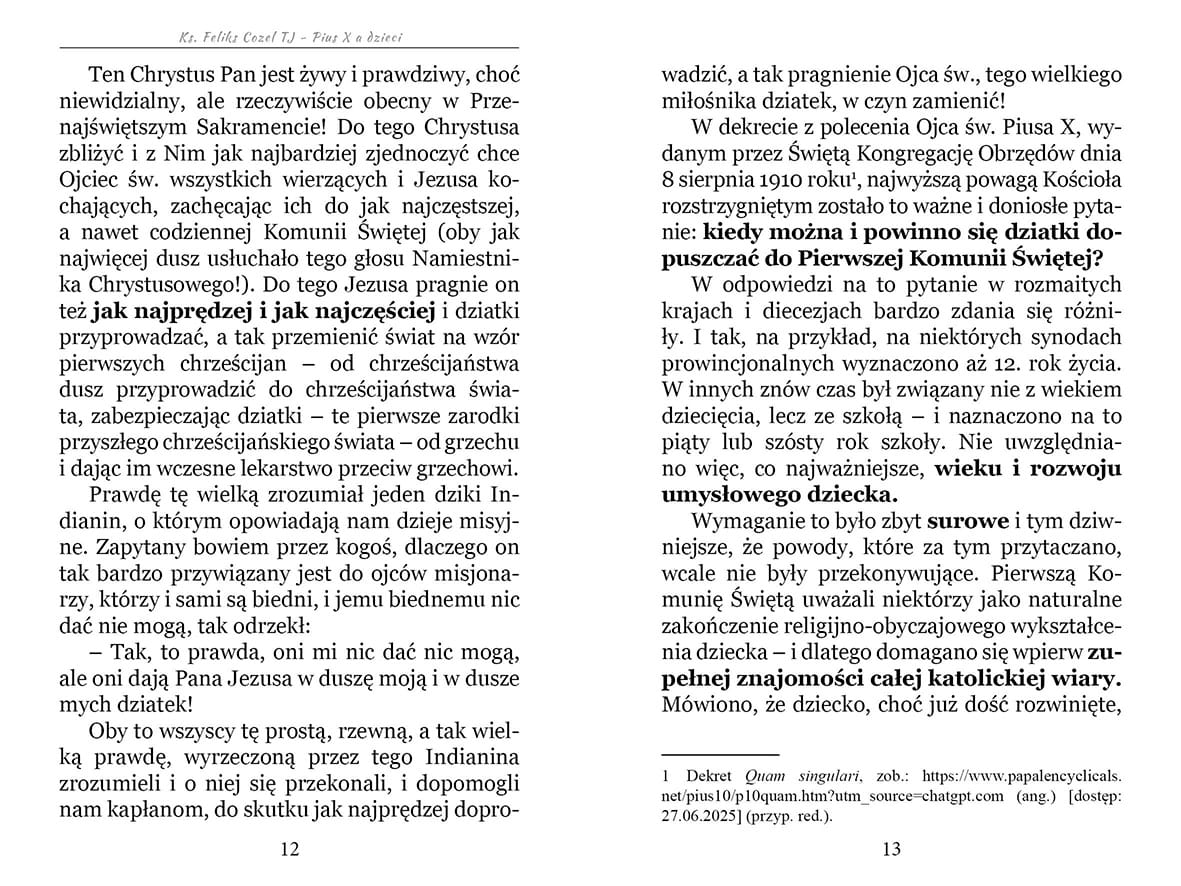 Wbrew pozorom jest to dokument o ogromnym znaczeniu – czyż może bowiem być coś ważniejszego niż dar łączenia się z Chrystusem w sakramentalnej komunii miłości i ufności? Ksiądz Cozel przedstawia przekonujące argumenty, ukazując, ile dobra przyniósł Kościołowi święty pontyfikat Piusa X oraz jak istotne były te zmiany dla duchowego rozwoju najmłodszych.