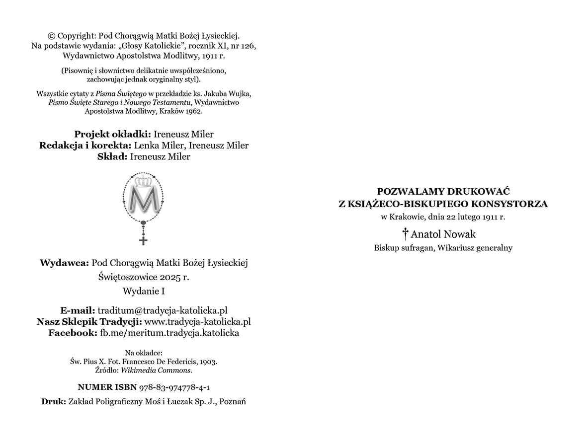 Prezentujemy Państwu kolejną książkę, odnalezioną w jezuickiej bibliotece w Krakowie. Tym razem jest to analiza dekretu Quam Singulari, wydanego przez watykańską Kongregację Sakramentów na polecenie papieża Piusa X i podpisanego przez kardynałów Ferratę oraz Giustiniego. W dokumencie tym papież formalnie ustalił, że Pierwszą Komunię Świętą należy udzielać dzieciom od momentu osiągnięcia tzw. wieku rozeznania (około siódmego roku życia).