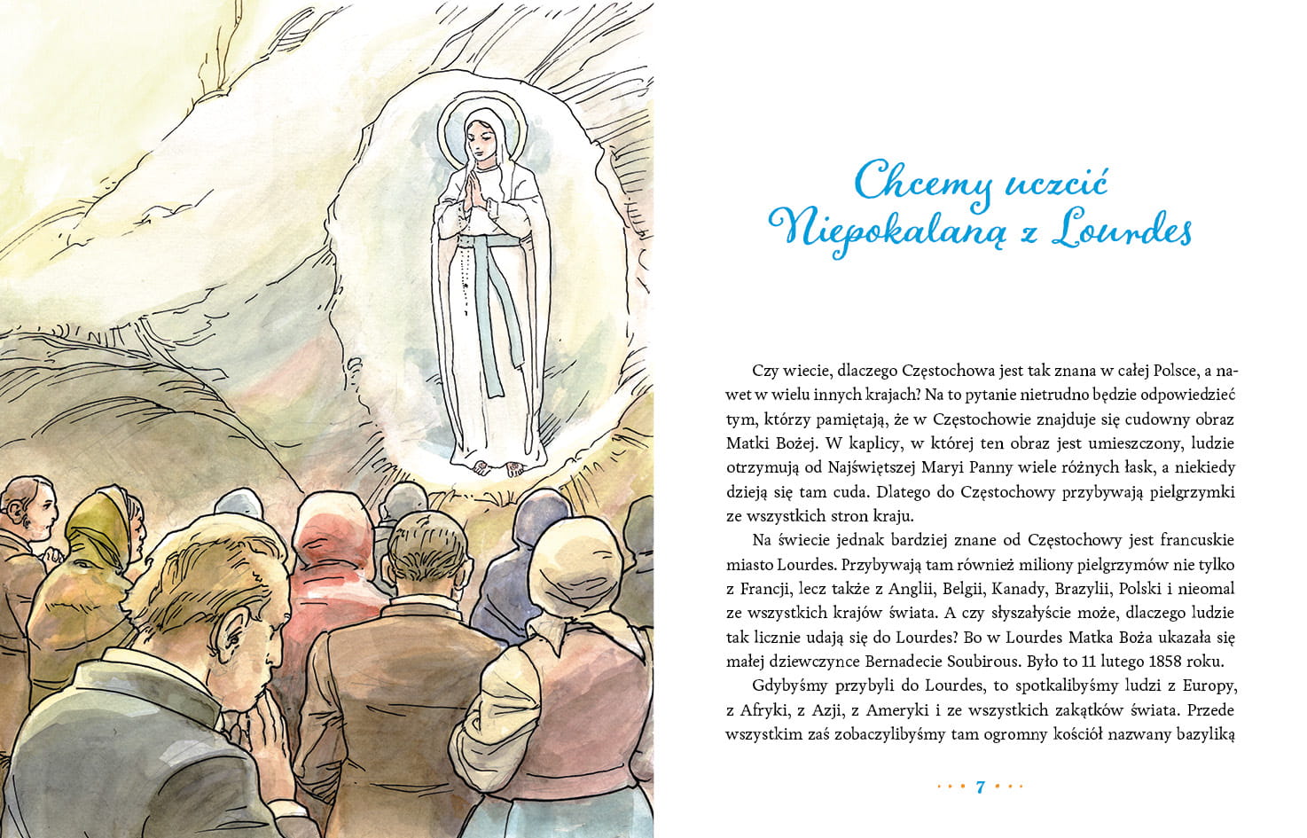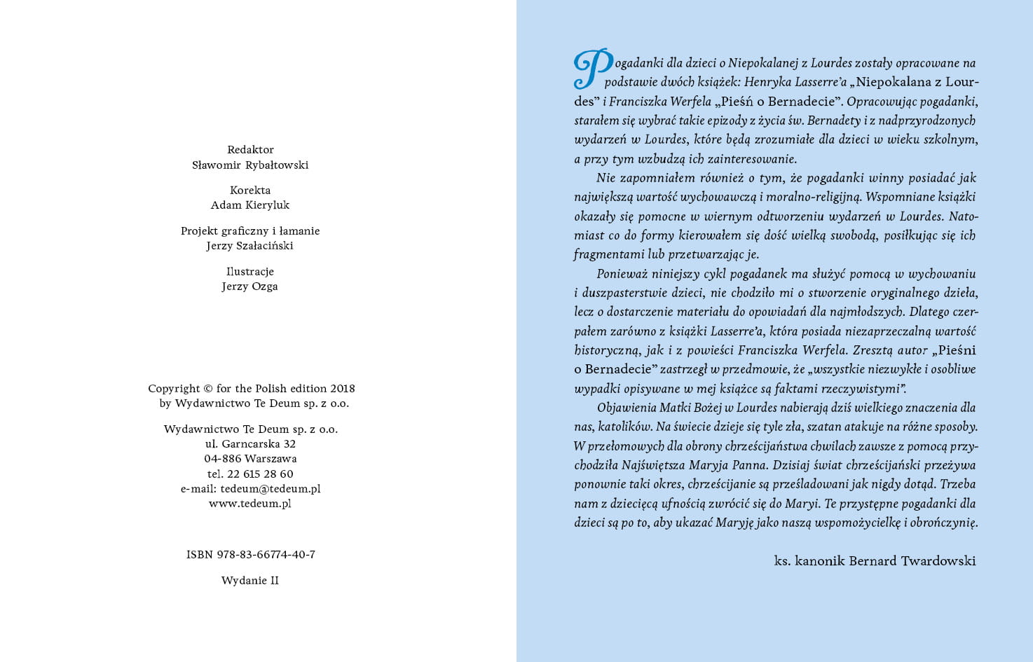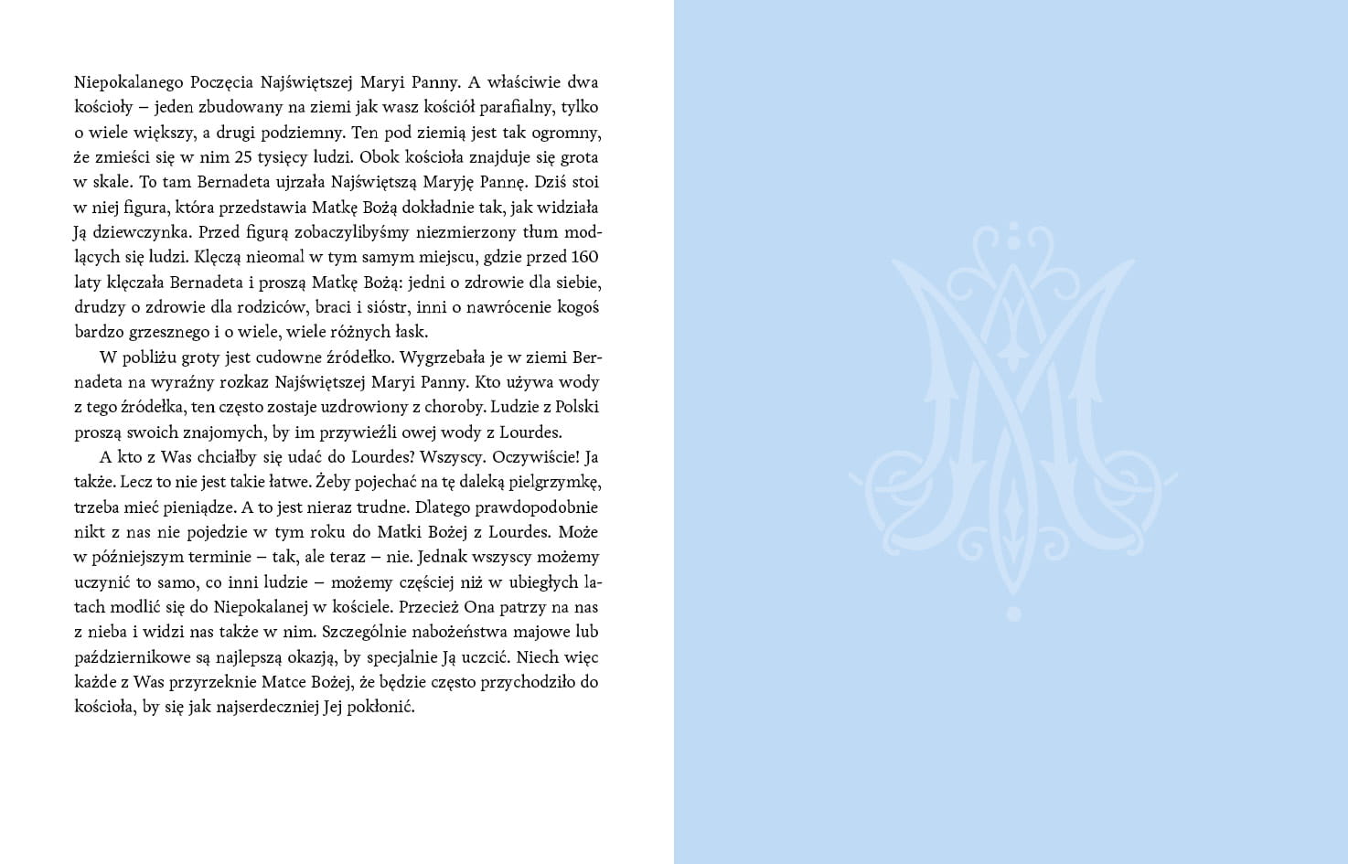 Chyba niełatwo spotkać dziś książkę dla dzieci taką jak ta, którą właśnie trzymasz w ręku – i nic dziwnego, bo jej autor, ks. kanonik Bernard Twardowski, napisał ją ponad 50 lat temu! Tym, co chyba najbardziej w niej uderza, jest miłość autora do Matki Bożej i chęć, żeby pokochali Ją także Czytelniczki i Czytelnicy jego Pogadanek. Ale nie chodzi tu wcale o jakieś sentymentalne uczucie, wyrażane tylko słowami... nie! Ks. Twardowski wprost pisze, na czym ma polegać prawdziwa miłość do Najświętszej Maryi Panny: otóż na ciągłej pracy nad sobą, nad swoim życiem, na tym, żeby goręcej i chętniej się modlić oraz lepiej odnosić się do swoich bliskich – rodziców, rodzeństwa, dziadka i babci, koleżanek i kolegów – a także i innych osób (na przykład sąsiadów). Autor podaje wiele konkretnych przykładów, co mogą i co powinni zrobić ci, którzy w swoim życiu chcą naśladować Bernadetę – prostą dziewczynkę z ubogiej rodziny, której 160 lat temu we francuskim Lourdes objawiła się Matka Boża.