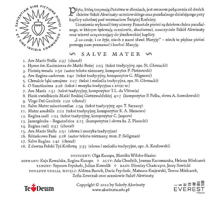 Salve Mater jest owocem połączenia sił dwóch chórów Szkół Akwinaty: uczniowskiego oraz parafialnego działającego przy kaplicy szkolnej pod wezwaniem Świętej Rodziny. Na płycie znajdziecie Państwo aż 18 utworów! I co czuje i co żyje niech z nami sławi Maryję - niech te piękne pieśni pomogą nam poznawać i kochać Maryję.