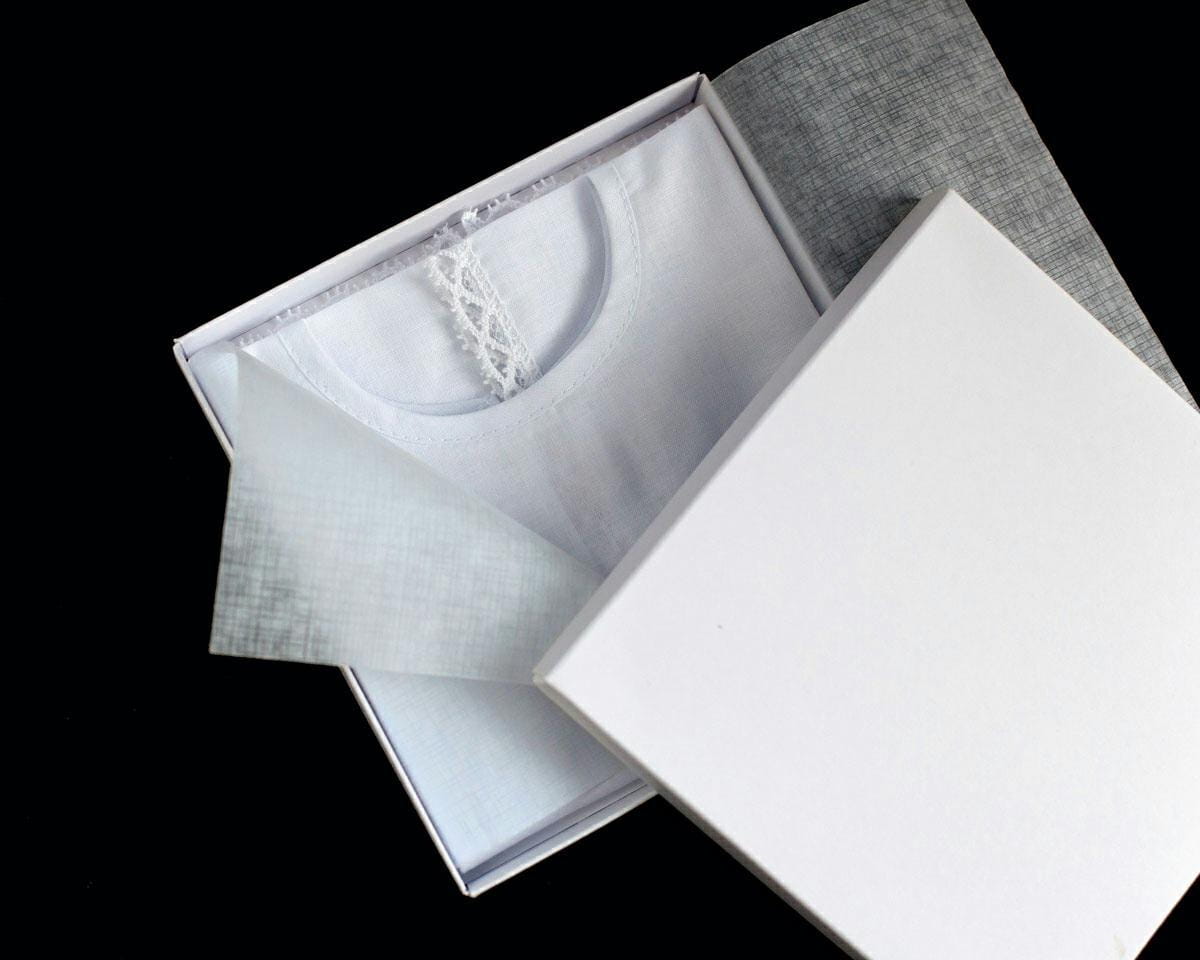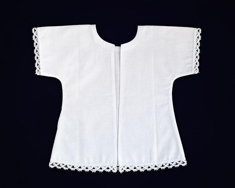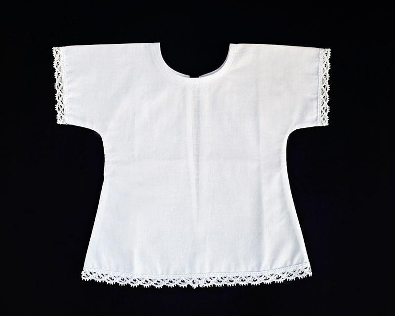 Biała szatka do chrztu o kroju prostej koszulki z rozcięciem z tyłu. Uszyta w Polsce z wysokiej jakości bawełny o płóciennym splocie, wykończona delikatną bawełnianą koronką.