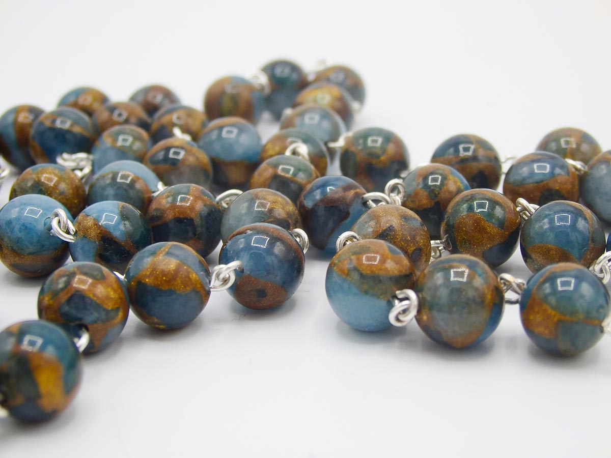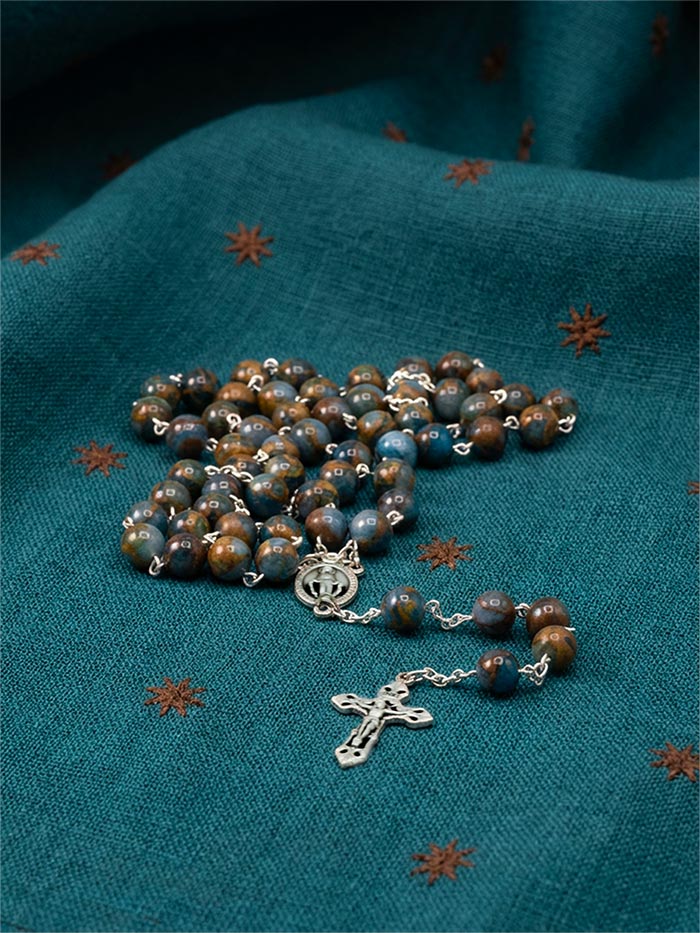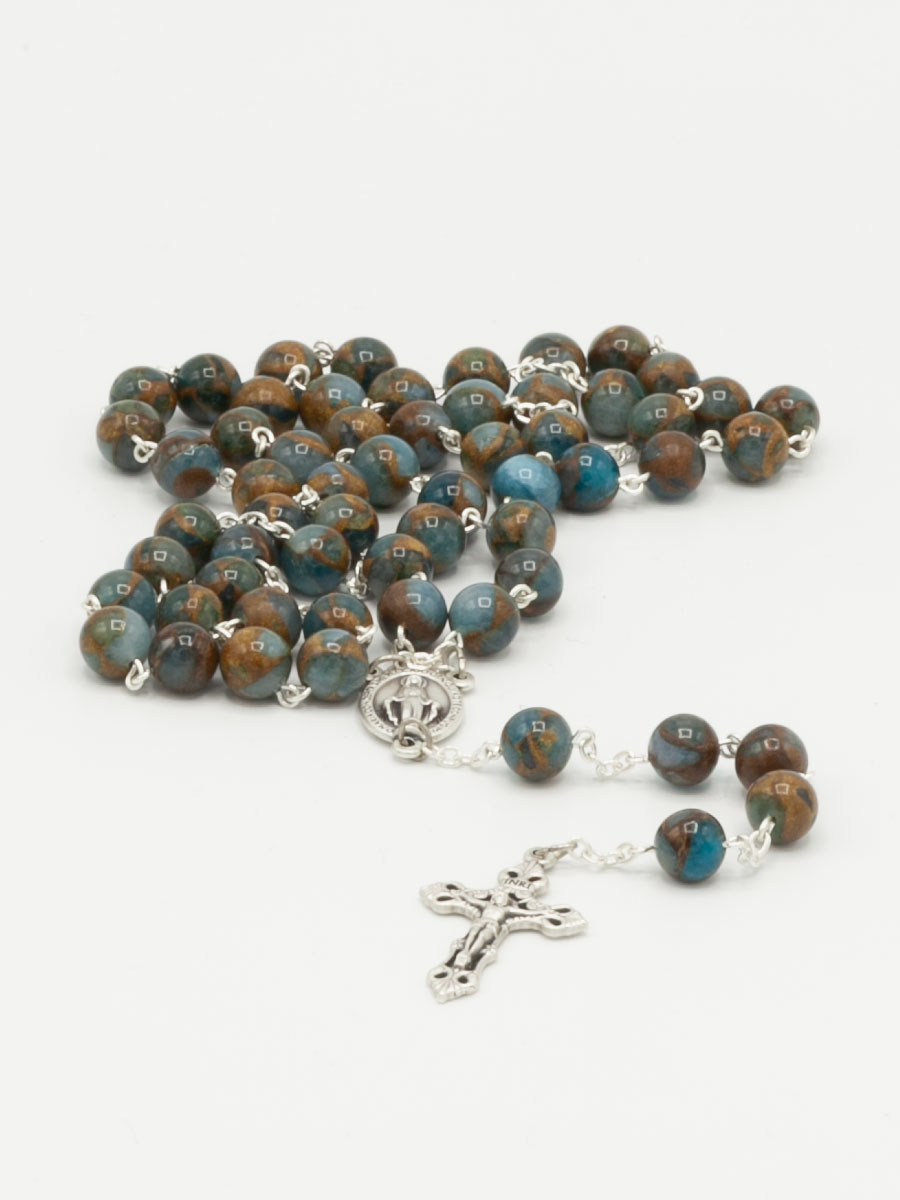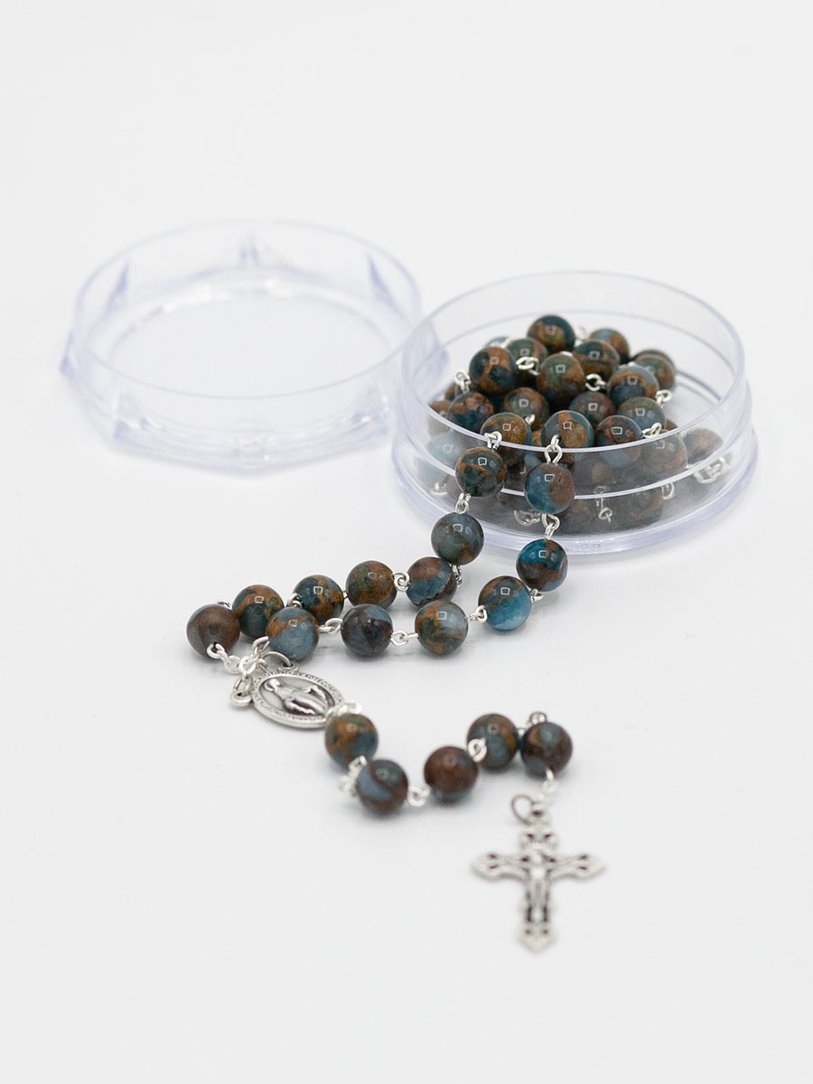 Różaniec z paciorkami o średnicy 8 mm z kamienia "jezioro niebieskie" w kolorze brązowo-turkusowym na stalowym łańcuszku, z krzyżykiem o tradycyjnym kształcie (tzw. rzymskim) oraz łącznikiem w postaci cudownego medalika. Zapakowany w przezroczyste, plastikowe pudełko; całkowita długość różańca wraz z krzyżykiem - 52cm.