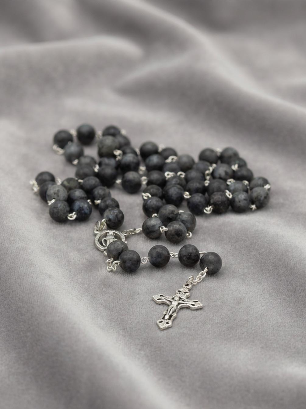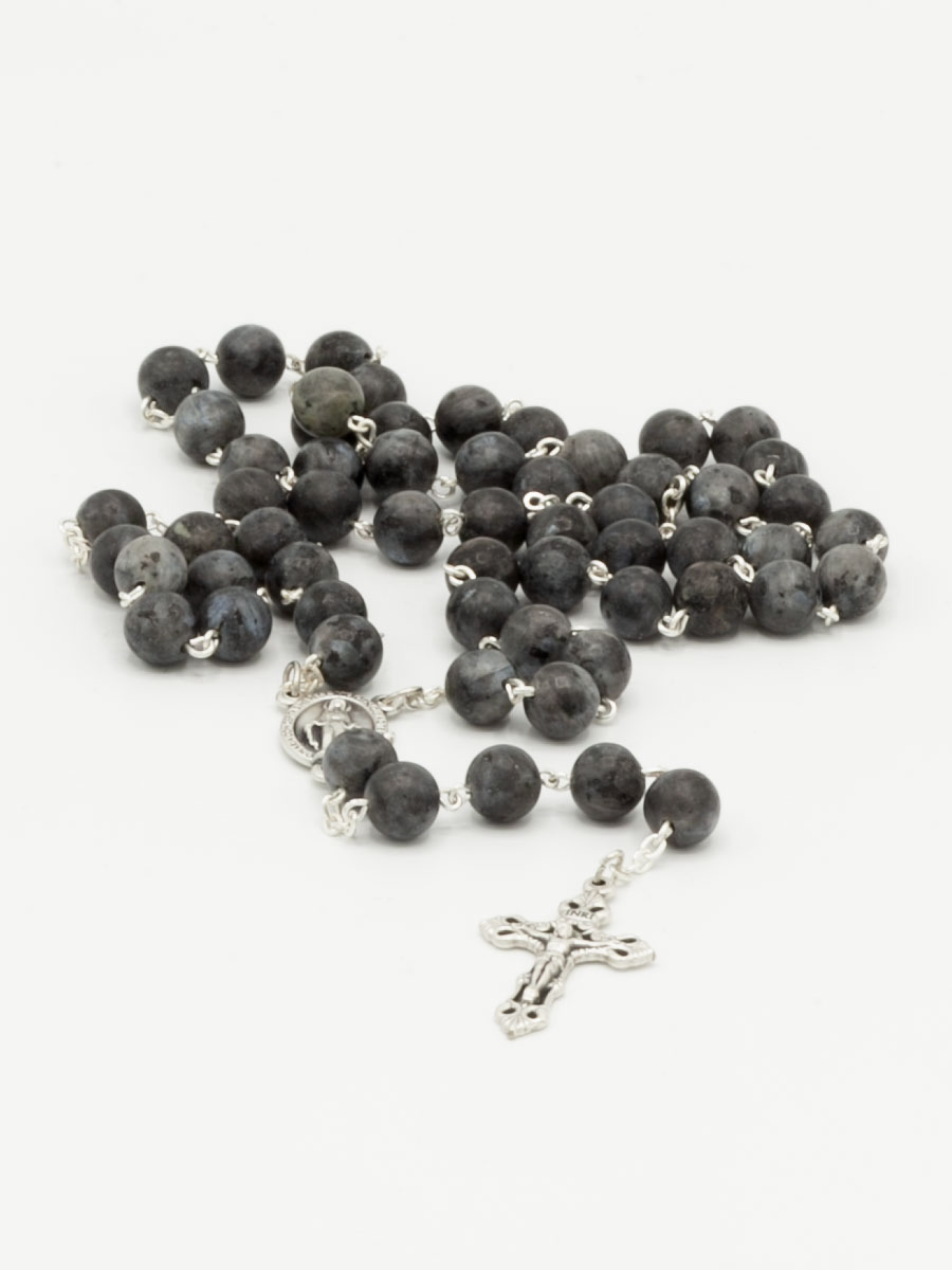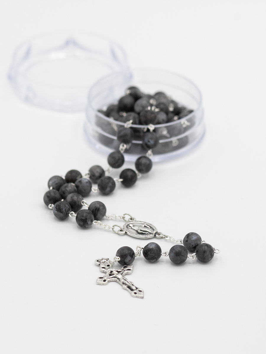 Różaniec z kamienia naturalnego (larvikit - skała magmowa), z paciorkami o średnicy 8 mm, z krzyżykiem o tradycyjnym kształcie (tzw. rzymskim) oraz łącznikiem w postaci cudownego medalika. Zapakowany w przezroczyste, plastikowe pudełko; całkowita długość różańca wraz z krzyżykiem - 52cm.