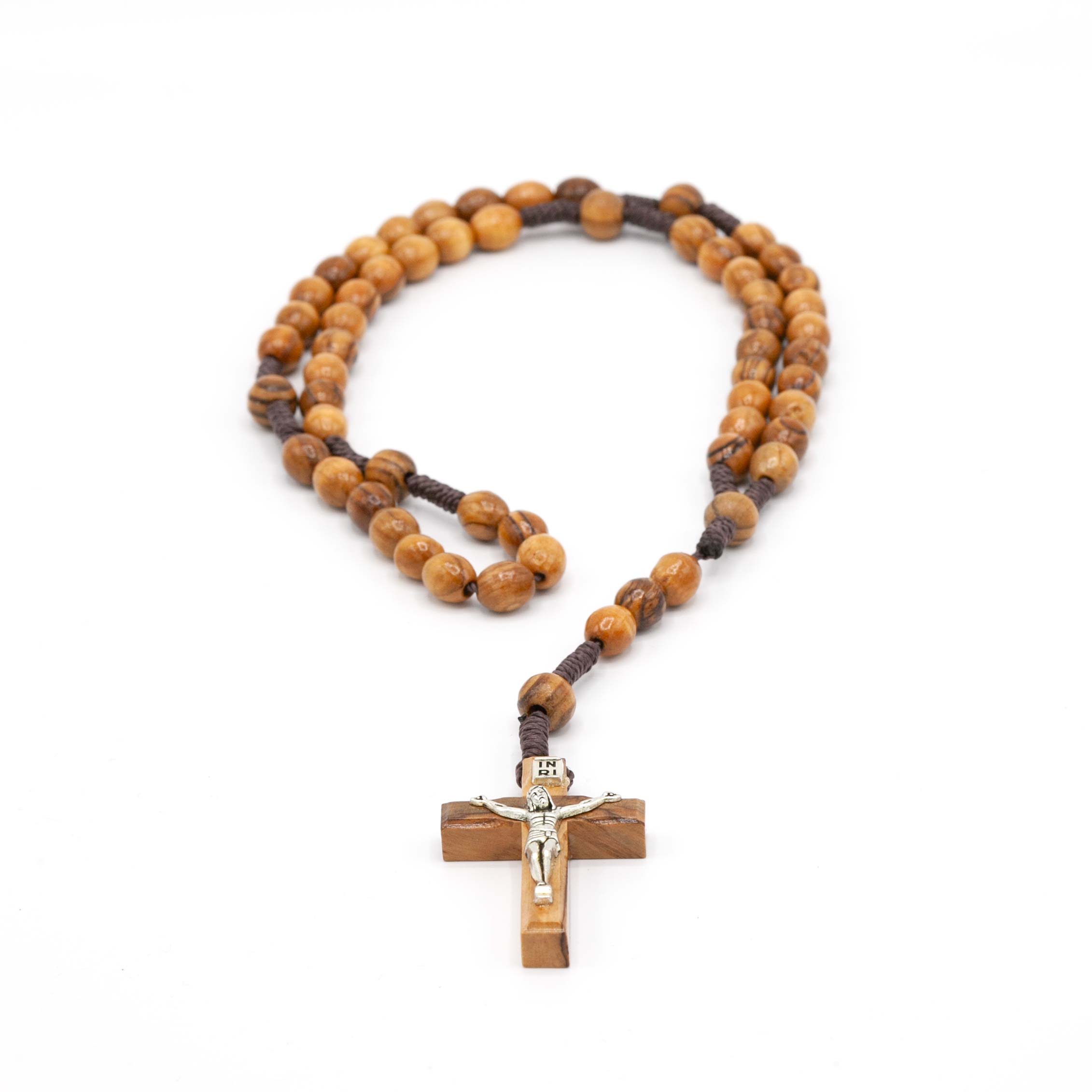 Solidny różaniec z drzewa oliwnego, krzyż drewniany (5 cm) z figurą Pana Jezusa i tabliczką INRI. Duże paciorki ok. 10x8 mm. Całkowita długość: 50 cm.