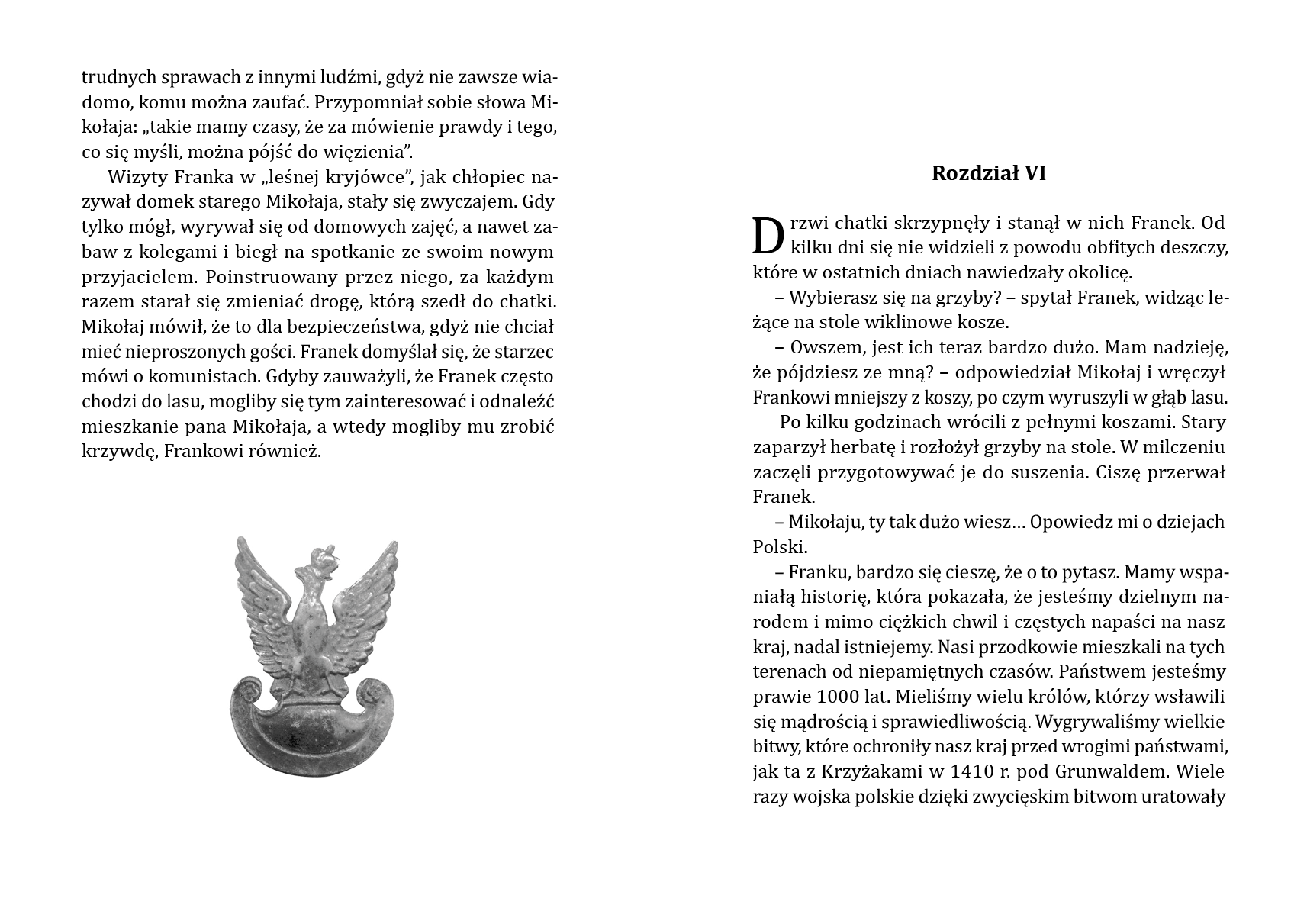 Drogi Czytelniku, nie będzie tu smoków, księżniczek i czarów. Zabieramy Cię w podróż do prawdziwego świata. Bohaterowie, o których przeczytasz, byli tacy jak Ty. Może nawet nosili to samo imię. Dlaczego żyli w lesie? Przed kim się ukrywali? Chcemy opowiedzieć Ci historię niezwykłą, która mogła się wydarzyć. W tym tajemniczym lesie zapomnisz na chwilę o komputerze, grach. Zapomnisz nawet, że czytasz ją w wygodnym fotelu. Będziesz czuł zapach ogniska, usłyszysz szum lasu, a na polanie zobaczysz ich - Żołnierzy Wyklętych.